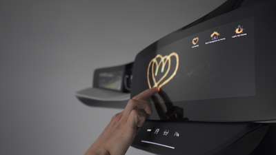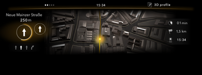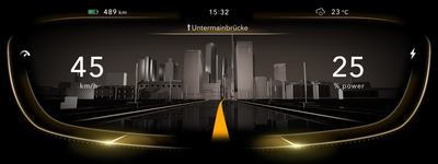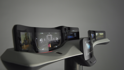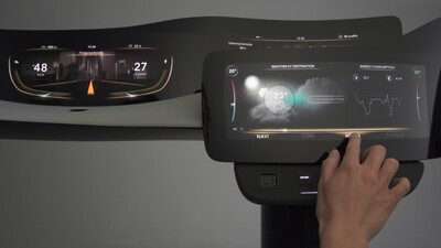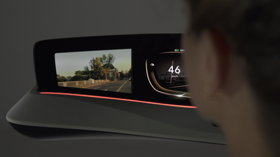 Here, a large-format high-tech glass display blends harmoniously into the three-dimensional form of the interior design. The display shows all functions realistically, integrates camera photos and operating elements and to all intents and purposes replaces the old analog dashboard.