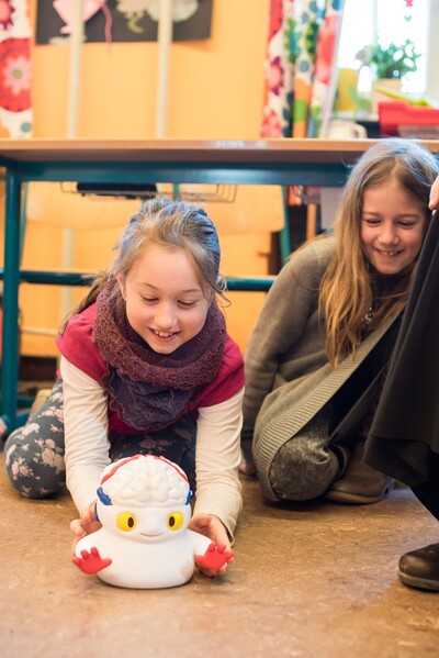 Schoolchildren in grades 3 and 4 are putting themselves in the shoes of brain researchers and finding the answers to questions about the brain by carrying out their own experiments. Thereby they learn how the brain works and how it is structured. What is particularly special about this teaching unit is “Herr Tie” - a robot that we have developed that can see, hear, touch and move around the room. The children can have a look inside the robot’s brain and can switch the relevant brain regions on and off. As a result, the robot changes its behaviour and, by trying it out and experiencing it, the schoolchildren are able to grasp the abstract topic of the “brain” and experience it as something that is tangible.